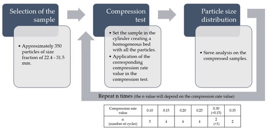 For the interparticle breakage, the mono-sized particles are located in the piston chamber with several inter-contact points between the particles and the cylinder surface, as Figure 2 shows. It is necessary to avoid unfilled spaces between particles in the bed. Homogeneity is achieved by a good reorganization of the particles by shaking the piston chamber with the particles before the test. The tested values for the compression ratio are 0.10, 0.15, 0.20, 0.25, 0.30 and 0.35. For each compression ratio, the samples are compressed and sieved a number of times or cycles to analyze the particle size distribution as a function of the compression, 0.10 is repeated 5 times or 5 cycles, 0.15 is repeated 4 cycles, 0.20 4 cycles, 0.25 4 cycles, 0.30 2 cycles with an addition of one cycle of 0.15, and 0.35 2 cycles. In Figure 3, the test procedure for the experiment is described. The suggested test is designed to simulate the conditions where a volume of material is compressed in a real crushing chamber and it is based on the work of Evertsson [].