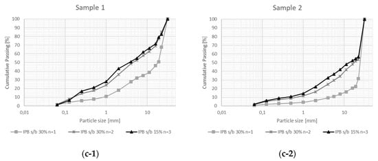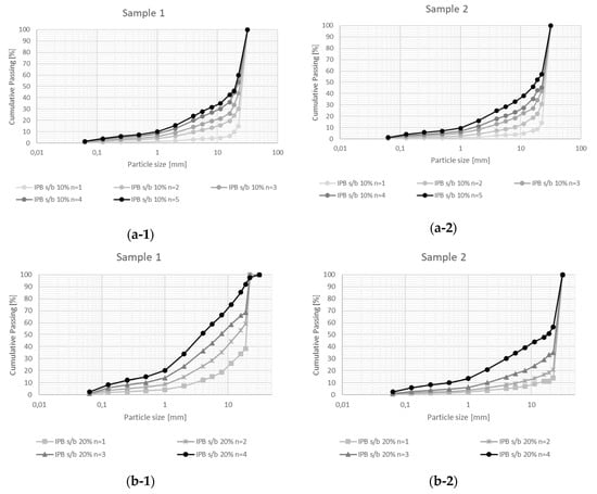 Product particle size cumulative distributions for Penouta ore sample 1 and sample 2 for (a) IPB s/b 10% test series (n = 1 to n = 5), (b) IPB s/b 20% test series (n = 1 to n = 4), and (c) IPB s/b 30% test series (n = 1 to n = 3). Where s/b is the compression ratio and n is the number of cycles.