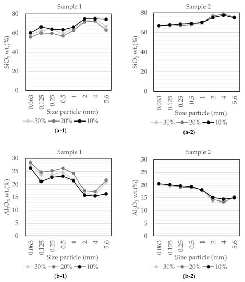 Major, minor and trace element analyses were performed on the sieved products generated in the crushing sequence in the compression breakage test for 10%, 20% and 30% of the compression ratio in the final reduction step (black lines in Figure 4). The bulk chemical data offers information on how the element distribution is related to particle size and compression ratio. The representative composition of the ore in the different class size fractions is presented in Table 2 for a compression ratio of 30% and for selected number of elements. Niobium, tin and tantalum content in different size fractions after compression breakage at the three values of compression ratios for both samples are presented in Table 3. More elements were analyzed, which include, Cr2O3, TiO, MnO, P2O5, SrO, BaO, Ba, Ce, Cr, Cs, Dy, Er, Eu, Ga, Gd, Hf, Ho, La, Lu, Nb, Nd, Pr, Rb, Sm, Sn, Sr, Ta, Tb, Th, Tm, U, V, W, Y, Yb, and Zr, and the totals of the analyses varied between 99.70% and 101.63%. Figure 5 represents the variation of major elements in size fractions for the three different compression ratios for both sample 1 and sample 2. Figure 6 represents the variation of trace elements in size fractions for the three different compression ratios for both sample 1 and sample 2.