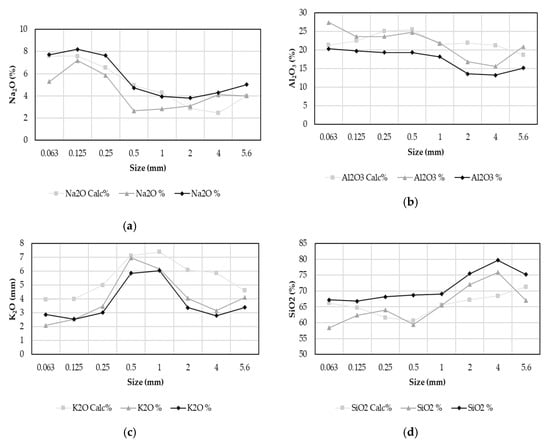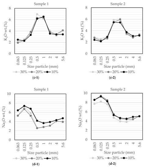 Representative composition of the Penouta ore after compression breakage for: (a) silica oxide; (b) aluminum oxide; (c) potassium oxide and (d) sodium oxide, for sample 1 and sample 2.