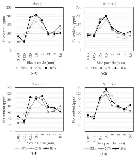 Niobium (Nb), tin (Sn) and tantalum (Ta) content in different size fractions of the Penouta ore after compression breakage at compression ratios of 30%, 20% and 10% for samples 1 and 2.