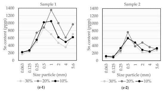 Representative trace elements content of the Penouta ore after compression breakage for (a) tantalum, (b) niobium, and (c) tin potassium oxide for sample 1 and sample 2.