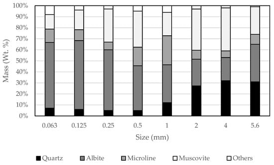 Results of the XRD in the different size fractions are presented in Figure 7, which shows the quartz, albite, microcline and muscovite content for sample 1.