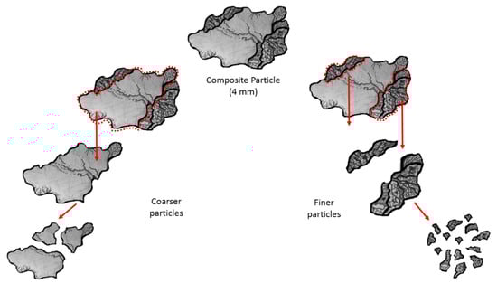 A simple conceptual model for the induced fractionation of minerals during crushing is presented in Figure 12, which is based on the presented results and previous studies [,,]. Fractures and microfractures in matrix minerals possibly control the overall breakage behavior of the rock; as a consequence of this, most of the finer particles are generated from breakage of matrix minerals. In contrast, quartz megacrysts are much more difficult to break and therefore accumulate in the coarser size fractions. The ore mineral mainly occurs in association with matrix minerals, and this likely results in the liberation of ore-bearing particles at relatively coarse size fractions. However, the valuable minerals behave more competently than the microfractured matrix minerals and experience relatively modest size reduction in relation to their original size. This likely results in an enrichment of the ore-minerals in 0.25–1 mm fractions and a depletion in the finest fractions < 0.125 mm.