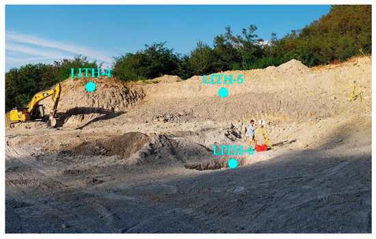 During the research at the testing site, the sampling for laboratory determination of bulk density was carried out in such a way that all samples were representative and respected the geological structure and distribution of the raw material in the deposit. Based on the geological structure and lithological changes in the deposit, 6 lithotypes (LITH) were selected from which 3 samples were taken. A total of 18 samples were analyzed. Samples were taken from two profiles (Figure 2 and Figure 3).