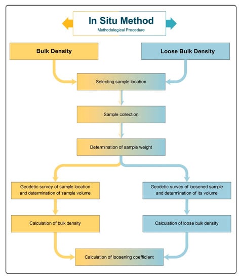 In order to determine the loose bulk density, the weighed sample must be deposited in a loose state on a stock-pile, followed by a determination of its volume. The loose bulk density is then calculated as the ratio of the weight of the sample to the volume of the material deposited in the loose state in the stock-pile. The whole methodological procedure of determination of bulk density and loose bulk density by in situ method is shown on the workflow diagram—Figure 4.