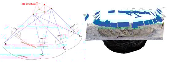 left—the principle of the SfM photogrammetric method (after [34]); right—imaging stations for SfM processing in the case study.