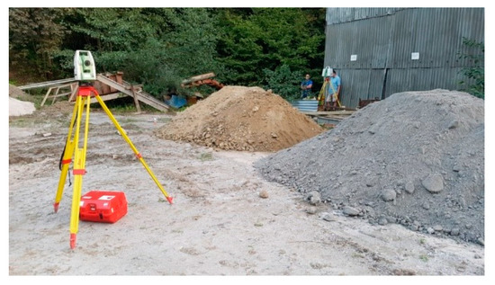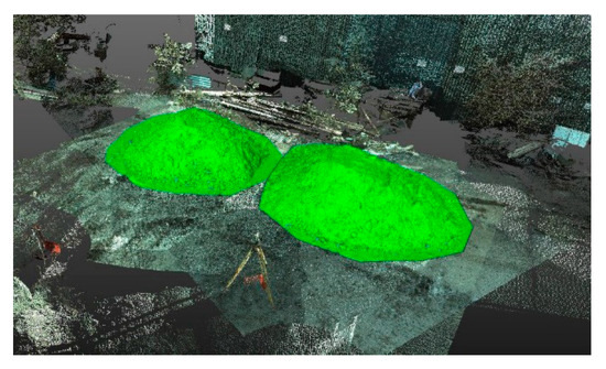 For the determination of loose bulk density, it was necessary to determine the volume of loosened mineral from the large-scale samples Probe 1 and Probe 2. For this purpose, the raw material from the large-scale samples (after the weighing process) was deposited on a horizontal reinforced panel surface on two separate piles (Figure 12). The volume of these piles was measured by TLS from four scanning stations. The connection of measurement to geodetic control and determination of volume was performed similarly to the measurement in the quarry.
