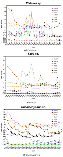 Nonetheless, the radial movement of elements in xylem has to be considered. The radial distribution of trace elements in xylem are influenced by the stability of the minerals in annual rings [31,32] and the radial movement in xylem is attributed to the tree ring structure. Navais et al. [31] reported that water passes through the annual ring via radial parenchyma cells in coniferous wood, such as Fagus, Acer, and Populus sp., while water movement is mainly confined to the outer stem in porous wood, such as those in the sycamore tree, making these porous species (e.g., Platanus sp.) more favorable for dendrochemistry. However, depending on the elements, the radial and vertical movements vary [21]. For example, elements with low levels of movement through the xylem in Norway spruce (coniferous) include Pb, Cd, Al, and Ba, elements with moderate movement include Sr, Ca, Zn, Cu, and Cr, and elements with high movement include As, Na, and Mg [33]. Genus Salix is able to accumulate significant quantities of metals in both leaves and roots, but the elements were detected with different patterns in the leaves, stems, and roots [34]. In some plants, a counteracting behavior of elements in the root is likely to occur for exclusion of toxic metals [35]. Therefore, potential errors associated with dendrochemistry are related to the behavior of chemical element species in the wood, and it is necessary to examine the application cases, respectively.