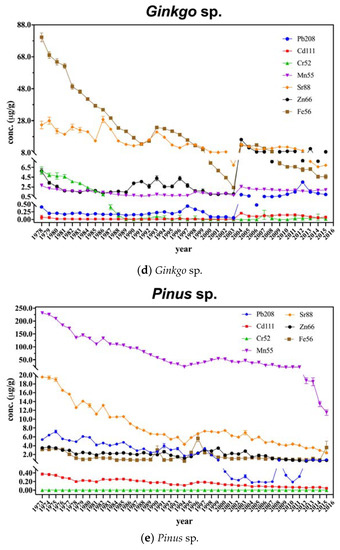 Time-resolved metal concentrations in the tree rings (±standard error). (a) Platanus sp., (b) Salix sp., (c) Chamaecyparis sp., (d) Ginkgo sp., (e) Pinus sp.