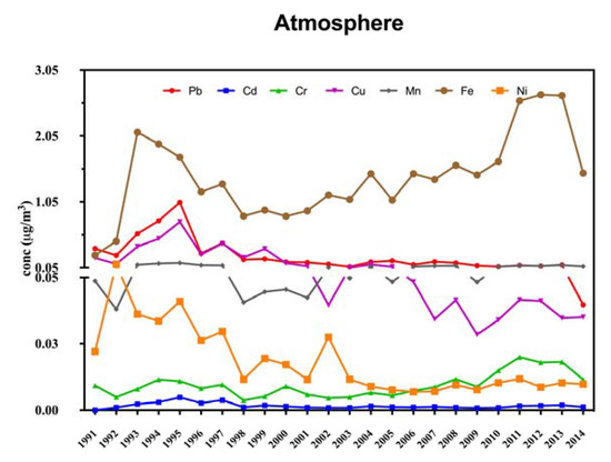 Metal concentrations in ambient air in D industrial site (1991–2014; data from Korean ambient air monitoring network). Metal concentrations suggest the annual average value of each metal.