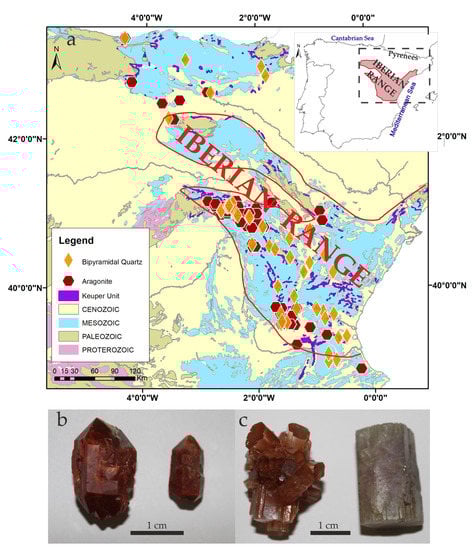 Within the Upper Triassic sequences in the Iberian Basin, Spain (Figure 1a), and in other European countries, the occurrence of both bipyramidal quartz crystals (Figure 1b) and pseudohexagonal aragonite crystals (Figure 1c) is common within mudstone, evaporites, and marls that represent saline mudflats and salt pond facies. The aragonite crystals occur associated with outcrops of pre-Hettangian alkaline magmatism and related to normal faults dated as Middle-to-Upper Jurassic. Their formation resulted from the mixing of infiltrated marine waters with hydrothermal fluids that circulated synrift faults []. The quartz crystals, on the contrary, appear in a wider range of locations (Figure 1a) with no close relation to major faults or volcanic deposits. Instead, they appear to be related to facies rich in organic matter and have numerous saline mineral inclusions, indicating that the original sediments formed in environments under strong evaporitic conditions.