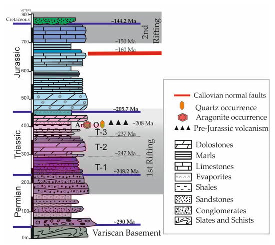 Upper Permian to Lower Cretaceous stratigraphic section in the Iberian Basin (lithology, thickness, and ages) and position of the occurrences of aragonite (Ar) and authigenic quartz (Q). Dates of the pre-Hettangian volcanism and the 1st and 2nd Rifting periods are indicated [] (T-1: Buntsandstein; T-2: Muschelkalk; T-3: Keuper; Modified from [].
