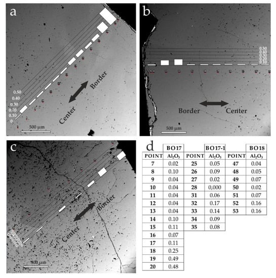 Electron backscatter images of the quartz samples: they were mostly composed of silica (88%). (a) Sample BO17; (b) Sample BO17-1; and (c) Sample BO18. Al2O3 appeared as ca 0.11%, but slight variations were detected from lower values in the center towards higher values to the edges of the crystals; (d) Al2O3 values represented in the three a,b,c lines of the figure (for microprobe data see Table 1).
