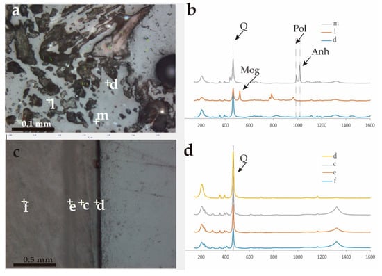 (a) Microphotograph showing the spots of measurement of Raman Spectrometry in the central part of euhedral quartz; (b) Image of Raman Spectra of micro-sampled spots d, l and m. Quartz (Q) appears together with moganite (Mog), anhydrite (Anh) and polyhalite (Pol); (c) Microphotograph showing the spots of measurement of Raman Spectrometry in the external part of a euhedral quartz; (d) Image of Raman Spectra of micro-sampled spots f, e, c and d. Quartz, in this case, was pure and more crystalline (X-axis represents Raman Shift /cm−1).
