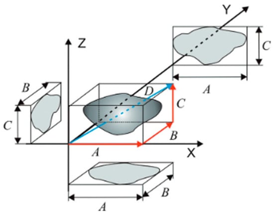 Modern video techniques, utilizing computer image analysis for determining the shape of particles, are becoming more commonly applied in particle shape evaluation. Even if technological development heading towards automation of measurements (i.e., microscopic pictures) allows for increasing the representative number of particles in the measurement, the methods based on the microscope generally include 2D image analysis. As a result, to some extent an incomplete information is generated because the analyzed particles are always situated on a plane in their most stable position [,]. Three-dimensional (3D) geometric data can be obtained by means of advanced optical microscopy, i.e., Axiovision’s topographic module [] or computed tomography [,], however the complexity of these methods limits their practical application only to basic research. Figure 1 shows the idea of spatial dimensioning of a single particle. The possibility of obtaining a large number of particle images in a short period of time, in a way that the results are statistically representative, is also a problem here. It seems that video analyzers based on the dynamic image analysis method (DIA) are the most suitable devices that might help in overcoming this problem.