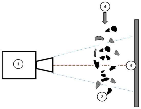 The scheme of dynamic image analysis (DIA) measurement system: 1—camera, 2—measurement volume, 3—light source, 4—feeding direction of particles.