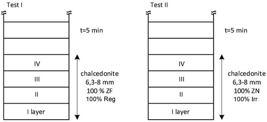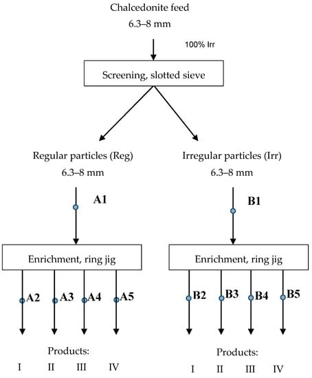 The material used in investigations was a chalcedonite within particles with a size fraction 6.3–8 mm, previously separated from a bulk aggregate feed. Samples of regular and irregular particles were separated by means of a slotted sieve bar. For the purposes of this paper, samples containing irregular particles were denoted as (Irr) while a sample with regular particles was described as (Reg). Scheme of investigations is presented in Figure 3. Feed and products of both samples were subjected to a visual analysis, marked in grey dots and described A1 to A5 (for regular particles) and B1 to B5 (for irregular ones).