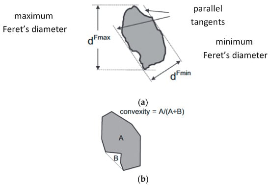 (a) Idea of Ferets’ diameters; dFmin—minimal Feret’s diameter, dFmax—maximum Feret’s diameter []. (b) Particle convexity; A—convex surface of the particle, B—concave surface of the particle [].