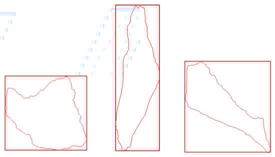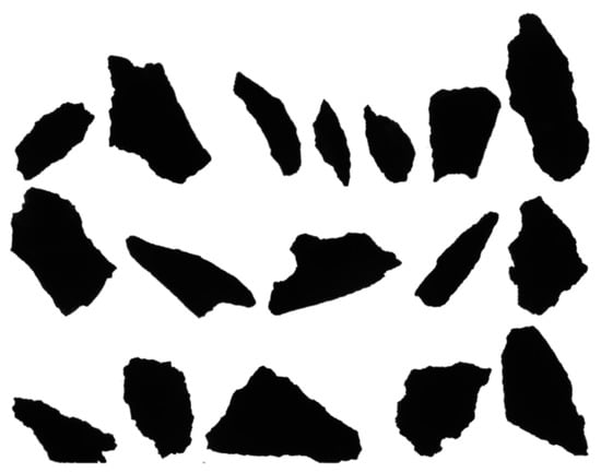 Figure 7 and Figure 8 show shapes of regular and irregular chalcedonite particles generated by means of computerized image analysis. As it was mentioned earlier, the shape was characterized according to the standard PN-EN 933-3: 2012 []. The norm defines the regular particles as those with the length not exceeding three times the width and thickness. The reason that DIA analysis was used separately in shape determination for regular and irregular particles is because application of various visual methods can be helpful in shape analysis for products of the plant scale jigging process, as well as regular aggregate production and enrichment according to the patented solution. These methods can replace mechanical methods used in particles shape control [].