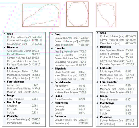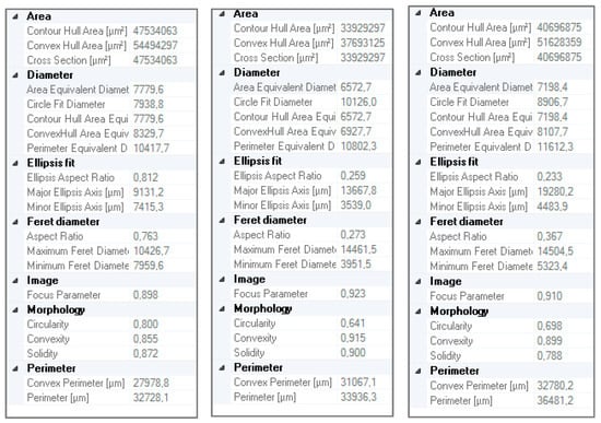 Quantitative geometry characteristics of selected regular and irregular particles are shown in Figure 9 and Figure 10. Many parameters and shape coefficients have been presented here, describing in detail the geometrical properties of each registered particle, such as: area, circumference (perimeter), equivalent diameters (equivalent diameter), Feret’s diameter, ellipsis fit, or the coefficients of solid and particle shape (morphology), as well as the image focus parameter. Depending on the needs, individual parameters give an opportunity for detailed analysis of particle geometry. Such characteristics were performed for each single particle within the sample, which served as the base for further characteristics in terms of particle size, convexity, circularity and aspect ratio indices.