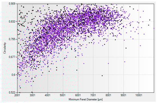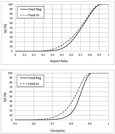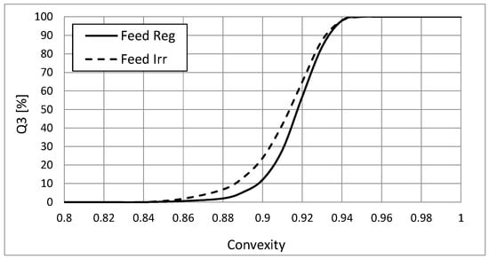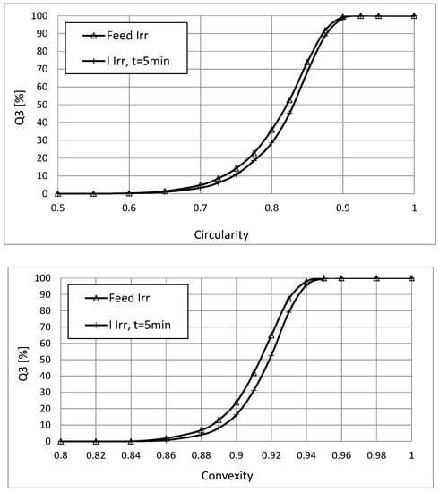 An analysis of summary diagrams with the distributions of the Feret’s minimum diameters and convexity and circularity coefficients of both studied populations of particles (Figure 20, Figure 21 and Figure 22) show the differences in particle size, surface structure and the shape of regular and irregular particles for feed and the products. Samples with irregular particles were characterized by a higher yield of fine grains (Figure 20), had less circular shape (Figure 21) and irregular surface (Figure 22).
