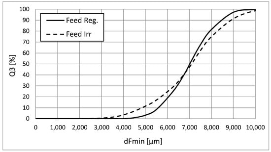 Cumulative particle size distribution functions of chalcedonite feed with regular (Reg) and irregular (Irr) particles.