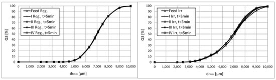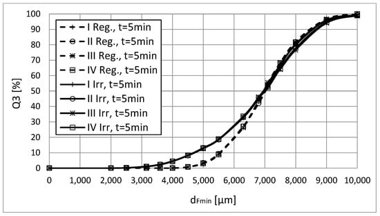 Variations in shape coefficient values obtained for regular and irregular particles could indicate for various particle size compositions of both samples. The performed analysis of the particle size distribution according to the minimum Feret’s diameter dFmin carried out for the tested feed with regular and irregular particles, prepared on slotted sieves, indeed showed the differences in their particle size (Figure 12). The feed material with irregular particles contained twice as many fine particles (below 5 mm). The visual system for these particles dynamically recorded the smallest third dimension of irregular particles, indicating their flatness, as the minimum Feret’s diameter and thus decreased the result of particle distribution. In the area of intermediate particles physically measured on 6.3 mm and 8 mm slot sieves, dynamic image analysis measuring their particle size distribution according to dFmin underestimates the proportion of irregular particles in the feed. However, it overestimates the yield of these particles in the upper particle size range, close to the size of 8 mm, obtained on a slotted sieve. This is due to the fact that irregular particles are randomly registered by the visual system, as well as in the orientation displaying the two largest dimensions, without capturing the third—the smallest, and that one gives information regarding the flatness (irregularities) of these particles. These two larger dimensions of irregular particles are usually greater than the corresponding dimensions of regular particles within the same particle size class. Differences in the distribution of particles between regular and irregular ones are therefore directly related to differences in their shape. It can be assumed that the differences would be greater with the use of the 3D technique, which in each case takes into account the third dimension of the particle, and not only randomly in the case of a convenient orientation of the particle, such as in the case of the DIA method.