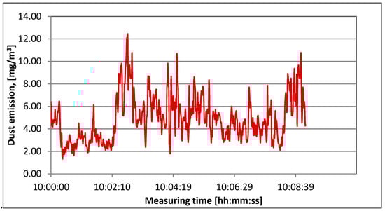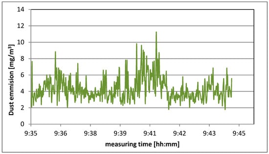 Irregularities in particle size distributions, as well as various values of selected shape factor may also indicate the various content of very fine particles in individual samples. This may be effective in different enrichment performances depending on whether the particle is regular or not. Considering the shapes of particles, especially for flat shapes, elongates particles with sharp edges, in operations of material handling a more intense dust generation, resulting from micro breaking or particle corner abrasion, can take place. Measurements for both feed samples (i.e., regular and irregular particles) were performed by means of the Casella dust measuring device. Figure 16 and Figure 17 present the registered dust emission for Reg and Irr feed along with base characteristics, while Table 1 summarizes the results obtained for all enrichment products.