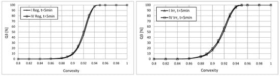 Distributions of convexity index for enrichment products I and IV for regular and irregular particles.