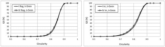 Comparison of Circularity distributions of chalcedonite enrichment products for regular and irregular particles.
