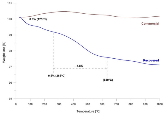 The thermal gravimetrical analysis of commercial and recovered barite samples is presented in Figure 3. In the range 20–1000 °C, there was no change in mass loss of commercial barite. In contrast, in the case of recovered barite, a different behavior in mass loss was observed. The TGA curve for recovered barite showed three stages; the first stage started at 20 °C and ended at 125 °C, the second stage started at 125 °C and ended at 265 °C, while the third stage occurred at 285 °C and ended at 630 °C. Over 630 °C further regular mass loss of the sample was observed. The mass loss estimated for the three stages was 0.6%, 0.5%, and 1.8%, respectively. The mass loss in all these stages was caused by the loss of water, which occurred as molecules adsorbed on the recovered barite surface and potentially as water present inside the barite structure. Additionally, these results were confirmed by the FTIR analysis.