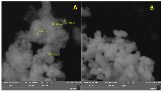 SEM analysis revealed commercial barite particles with a well-defined contour and size >400 nm (Figure 4A). In contrast, the particles of recovered barite were characterized by a diffuse contour and submicron 100–400 nm size (Figure 4B).