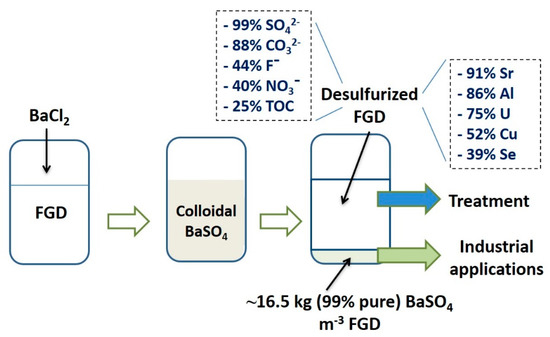 In the light of the growing demand for materials and the depletion of natural resources, the implementation of circular economy is gaining ground worldwide. This approach attempts to recover and reuse part of the materials and energy used in the production cycles. To this end, waste products are no longer regarded as undesirable, unusable wastes, but rather as secondary resources. Because of its high density (4.48 g·cm−3) and low water solubility, barite has numerous industrial applications including (i) density agent used for oil and gas industry drilling fluids, (ii) radiocontrast agent for X-ray imaging, (iii) component of white pigment for paints, (iv) paper brightener, (v) plastic high-density filler, and (vi) concrete radiation-blocking additive, etc. [28,31]. Although barite contains barium, a toxic metal, the extremely low solubility makes it significantly less problematic for the environment and human health than other Ba salts [28]. Using the studied FGD effluent, ~16.5 kg barite can be recovered per m3, thus confirming the theoretical calculations.