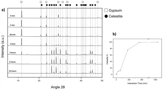 (a) X-ray diffraction patterns of gypsum crystals after different times of interaction with a 0.5 M Sr-bearing aqueous solution. The X-ray diffraction patterns show that gypsum grains are almost fully transformed into celestite after 6 h. After 24 h the transformation is complete. (b) Newly formed celestite content of the gypsum interacted samples, calculated from RIR analyses of XRD data, plotted against interaction time.