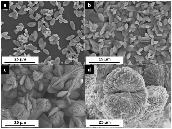 (a) SEM micrographs of micrometer-sized celestite crystals formed on a gypsum (010) surface after 10 min interaction with a 0.5 M Sr-bearing aqueous solution. Celestite crystals are initially bone folder-shaped. (b) After 30 min of interaction the whole (010) gypsum surface appears carpeted with celestite crystals. (c,d) With increasing elapsing time, celestite crystals gradually evolve from single crystals to crystal aggregates that are either (c) sheaf-life shaped (interaction time = 3 h) or even (d) spherulitic (interaction time = 1 day).