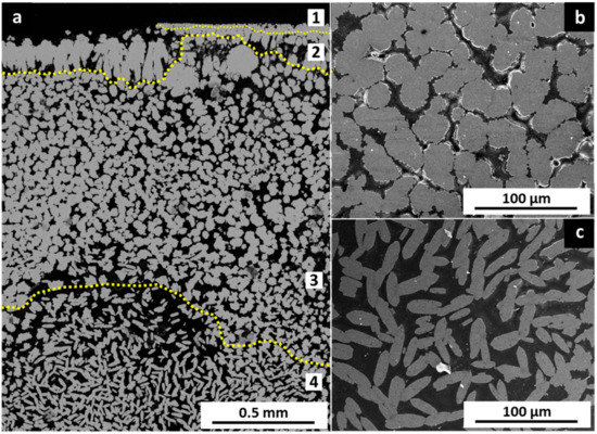SEM images of cross-sections of fully transformed celestite after gypsum pseudomorphs, epoxy-embedded and cut parallel to the original gypsum (010) surface, are depicted in Figure 5. These SEM images evidence that the progress of the gypsum-to-celestite transformation leads to the development of four distinctly textured celestite regions. These regions are clearly visible in Figure 5a, where yellow dotted lines highlight the boundaries between them. The region located closest to the external surface of the pseudomorph (Region 1) corresponds to the fine grained celestite described above. Immediately beside it, the previously described stockade-like structure appears (Region 2). Moving further closer to the core of the pseudomorph, there is a region defined by spherulitic celestite aggregates (Region 3). This region is around 1.5 mm wide and occupies most of the celestite pseudomorph. Celestite spherulites in this region are slightly graded in size, with the smaller sized ones (~20 µm in diameter) located closer to the boundary with the stockade-like structured region, while those that are located farer from it reach diameters around 40–50 µm (Figure 5b). These spherulites appear arranged leaving hollow spaces between them, defining a network of interconnected porosity. Finally, the region that corresponds to the core of the pseudomorph (Region 4) consists of elongated prismatic crystals (Figure 5c) that are less closely packed than spherulites in Region 3 and appear sparsely distributed within large volumes of porosity. It is worthwhile to note that the celestite crystals that constitute Region 4 have Ca-contents that are below the detection limit (<0.1 wt% Ca), while celestite crystals in the rest of the regions have Ca-contents between 0.6 and 1.2 wt%, according to their EDX analyses.