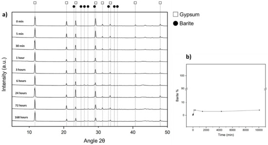 X-ray diffraction patterns of gypsum crystals after different times of interaction with a 0.5 M Ba-bearing aqueous solution. (a) Diffraction peaks corresponding to barite are absent in the diffractograms of gypsum samples interacted with the 0.5 M Ba-bearing aqueous solution during less than 30 min and are scarce and very weak in the diffractograms of all the samples that interacted longer times, indicating that gypsum barely transforms into barite regardless of the length of the interaction. After one week of interaction, the barite content of the gypsum sample barely amounts for 5 wt% (b) Newly formed barite content of the gypsum interacted samples, calculated from RIR analyses of XRD data, plotted against the interaction time.