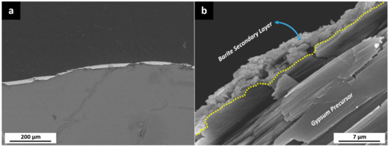 SEM images of cross-sections of gypsum crystals cut perpendicularly to their (010) surface after undergoing a 3 h and 7 days interaction with a 0.5 M Ba-bearing solution are shown in Figure 8a,b, respectively. Regardless of the interaction time, gypsum crystals appear encased by a very thin (<30 µm) shell-like layer of barite crystals. The small thickness of the barite layer is consistent with the very low barite wt% content of the gypsum reacted samples as estimated from XRD measurements.