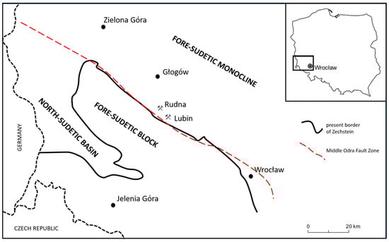 The locations of the Rudna IX and Lubin Główny mines against the Fore-Sudetic Monocline and Poland are shown in Figure 1. The sampling points of the Lubin minerals under scope are shown in Figure 2.