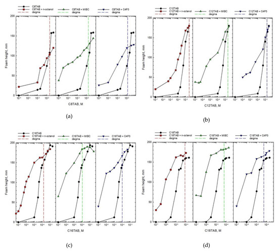 As seen in Figure 2, the height of formed foam increases with increasing the SAS solution concentration both for one-component and blended solutions, what is obvious and expected. However, the comparison of magnitude of this effect shows completely different trends. It is clear that in the case of blends, the concentration of the main solution component (CnTAB) necessary to obtain similar foam height is significantly shifted towards smaller values. This shift is the highest for smaller concentrations, where similar foam heights were observed for concentrations of CnTAB that differed even by two orders of magnitude. It is also evident that differences in the foam heights observed for pure and mixed solutions diminish with increasing concentration of the main component. Above a certain concentration the height of foam is practically identical or, as can be observed for CnTAB with n = 8, 12, and 16, even smaller for binary mixtures. The results presented in Figure 2 directly indicate that the non-ionic SAS addition to the CnTAB solutions caused a strong synergistic effect—foamability in binary mixtures is much higher compared to the one-component solution. However, this conclusion holds below the threshold concentration, which was called as critical synergistic concentration (CSC) [7].