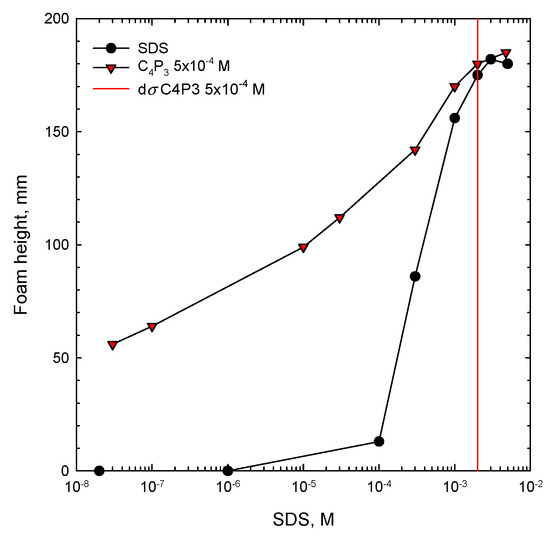 A similar picture can be observed for foamability performance of solutions of anionic SDS with 5 × 10−4 M of C4P3 as the non-ionic additive, presented in Figure 3. Here the synergistic effect starts in mixed solutions at very small SDS concentrations (of order of 10−8 M), where there was no foam formation in the one-component system. In mixed solutions foamability increased remarkably and the synergistic effect in this case is very strong. The vertical lines shown in Figure 2 and Figure 3 for each of the studied systems indicate the value of dσ, expressed as a difference between the surface tension of water (σwater) and the surface tension of solution of given concentration (σc). This parameter is crucial for discussion on the mechanism of synergistic effect existence and will be explained and analyzed in detail below.