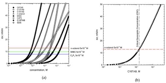 where σwater is the water surface tension and σ(c) is the surface tension of SAS of a given concentration [7,21]. Calculated dσ values for each studied SAS (one-component system) are presented in Figure 4 as a function of their solution concentration. There are additionally plotted (as horizontal lines) dσ values for non-ionic SAS solutions of given concentrations used as the additives for preparation of the binary mixtures. As seen, these lines delimit two dσ regimes, which are crucial for determination of the CSC value and was discussed in detail in our previous paper for n-octanol [7]. It was concluded there that n-octanol as the non-ionic additive to the cationic surfactant solution in a binary mixture, participates in the mixed adsorption layer formation at the rising bubbles surface and causes an increase in the E value of the liquid/gas interface. As a consequence, the solution foamability is enhanced. This effect, however, is significant only for the dσ lying below the threshold value, indicated by the horizontal line, above which the n-octanol molecules start to be a minor component of the adsorption layer [7], and where E values are determined mainly by the mixture main constituent. The way of determining the CSC values on the basis of dσ is presented in Figure 4b. A similar procedure was applied for two other non-ionic SAS with their mixtures with CnTAB solutions of various concentrations. From the intersection of the dσ vs. concentration dependence plotted for the main solution component and the dσ value calculated for non-ionic additive of given concentration, the CSC values were determined. These values indicated the threshold concentration of the mixed solution main component, for which, in the presence of specific non-ionic SAS of a given concentration, the synergistic effect on solution foamability was observed. The CSC values calculated according to this approach are listed in Table 3.