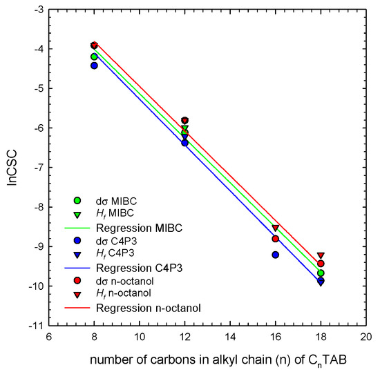 Figure 5 shows a correlation between CSC values taken directly from the Figure 2 (Hf CSC) and dσ CSC values determined for alkyltrimethylammonium bromides homologs (CnTAB, n = 8, 12, 16, 18). The solid lines are the linear regressions fitted to the determined CSC data. As seen, Hf CSC and dσ CSC stay in quite a good agreement, confirming correctness of the postulated mechanism about the additive character of the E parameter and crucial role of concentration-dependent contribution of the non-ionic additive into the mixed adsorption layer. The dependence of the CSC vs. concentration can be described by the following linear relations: