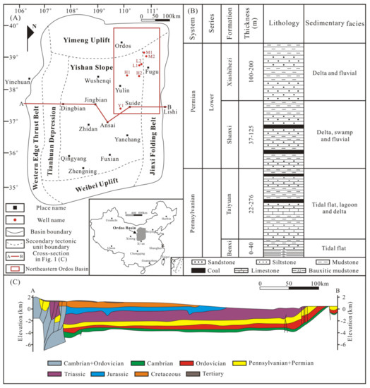 (A) Tectonic units and structural cross-section of the Ordos Basin; (B) Stratigraphic column and depositional environments of the Pennsylvanian and the Lower Permian strata in the Ordos Basin (modified from Yang et al. [13]; Yang et al. [14]); (C) Structural cross-section of the Ordos Basin (modified from Yang et al. [13]).