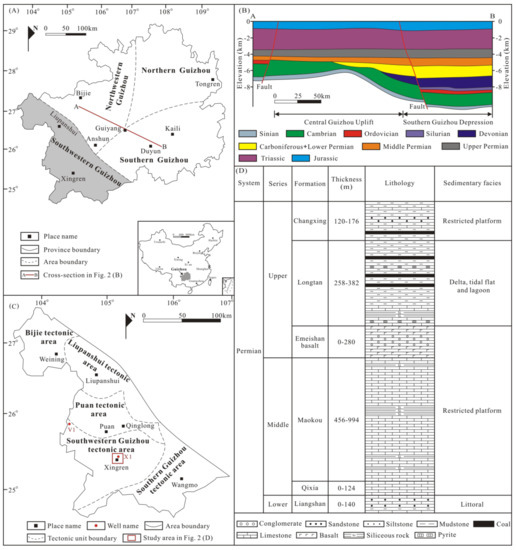 (A) Regional division and structural cross-section of Guizhou Province; (B) Structural cross-section of Guizhou Province (modified from Luo et al. [18]); (C) Tectonic units of southwestern Guizhou; (D) Stratigraphic column and depositional environments of the Permian strata in southwestern Guizhou (modified from Ma and Guo [16]).