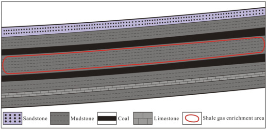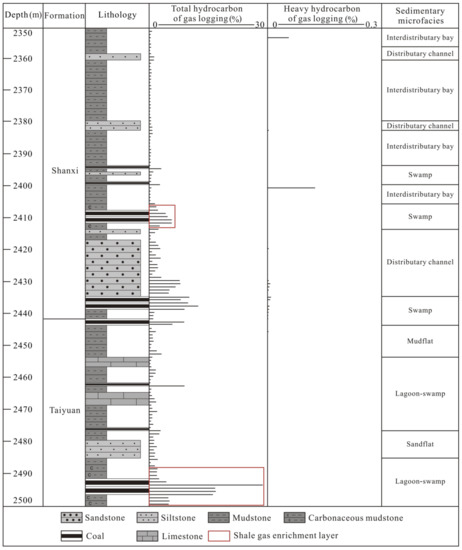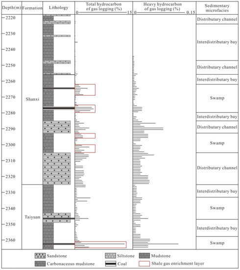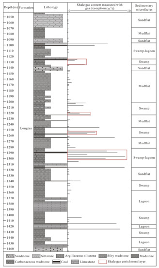 Transitional strata natural gas mainly includes shale gas, coal bed methane (CBM), and sandstone gas. Shale gas occurs mainly as adsorbed and free gas [28,29,30], and CBM occurs mainly in the adsorption state [31,32], while sandstone gas occurs mainly in the free state and reservoir space and cap rock control gas accumulation [33]. As three types of gas reservoirs are superposed onto each other in the vertical and horizontal directions within transitional strata, lithological associations have an important influence on shale gas enrichment characteristics. According to the cores and gas logging data from wells H1 and H2 of the Shanxi and Taiyuan Formations in the northeastern Ordos Basin (Figure 3 and Figure 4), and the cores and gas desorption data from well X1 of the Longtan Formation in southwestern Guizhou (Figure 5), carbonaceous mudstone adjacent to coal seams presents a high gas content level. Carbonaceous mudstone is rich in OM and has a strong gaseous hydrocarbon generation capacity. In addition, the migration of CBM to adjacent shale can increase the shale gas content levels. Together, these characteristics result in shale gas enrichment. Carbonaceous mudstone adjacent to coal seams is primarily developed in swamps in the delta plain environment, and lagoons and swamps in the barrier coastal environment (Figure 3, Figure 4 and Figure 5).