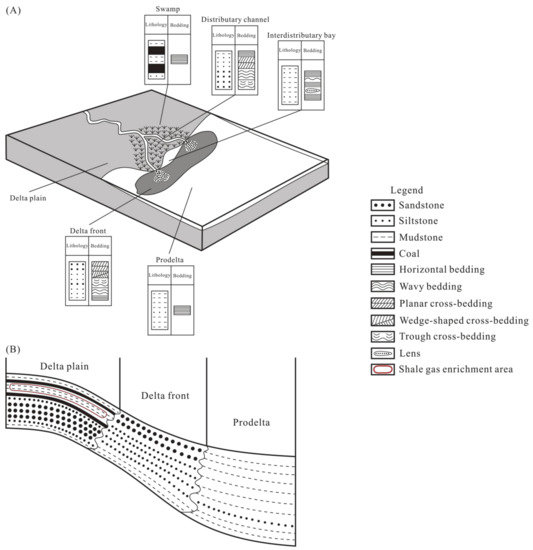 Shale gas enrichment characteristics of a delta environment: (A) stereogram (modified from Nichols [34]); (B) profile.