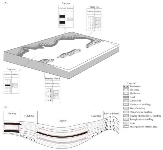 The barrier coast is developed in a transitional environment within which barrier island-tidal flat-lagoon-swamp systems can be formed [34]. The lagoon is a coastal body with very limited connections to the open ocean. The sediments are mainly fine-grained, and horizontal bedding is developed. The lagoon is in a quiet and low-energy environment in which large quantities of sediments are carried by rivers under rainy weather conditions. Anaerobic bacteria reproduce in the lower part of lagoon to form a reducing environment [36], which is favorable to the preservation of OM, forming an organic-rich shale and shale gas enrichment area (Figure 7). The swamp is widely distributed in the supralittoral zone, which presents a relatively weak hydrodynamic environment and fine-grained sediments. Abundant plants in the swamp lead to OM enrichment, and frequent alternations of high and low water levels result in mudstone interbedded with coal (Figure 7).