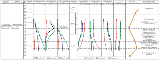 When 0.6% < Rmax < 1.6%, transitional shale enters the “oil window” [49,50] and kerogen pyrolysis generates a large number of liquid hydrocarbons, but few gaseous hydrocarbons are generated. Moreover, clay minerals transformation is not obvious, indicating that the transformation occurs mainly in the middle diagenesis B and late diagenesis stages. Micropores and mesopores are infilled by liquid hydrocarbon and bitumen due to large surface areas [51,52] and macropores are compacted during the period, leading to a decrease in the pore space.